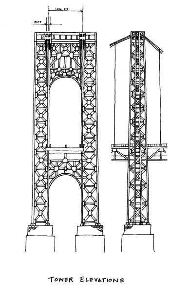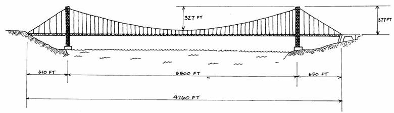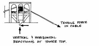 The tower supports of the bridge are 578 feet tall and rest on concrete caissons (supports) in the river. This analysis will assume that the towers will be subjected to only vertical loads because the cables are supported by rollers and cannot transmit any horizontal forces to the towers. Since the main point of this analysis concerns the structural behavior of the cables, no particular attention will be given to the towers.