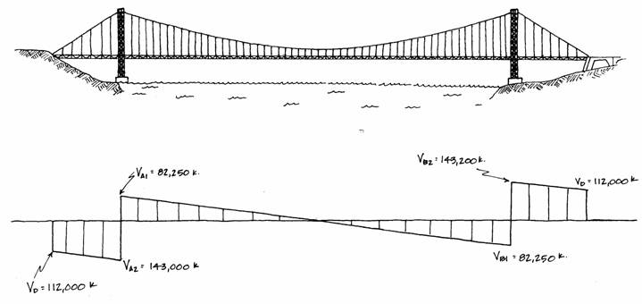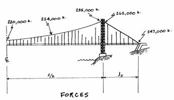 where d is the depth of the parabola at the midpoint, 327 feet, and l is 3500 feet. The vertical force component will have a value halfway between 82,250 kips and zero: 41,125 kips. Therefore, the axial force at the quarter points of the main span is: