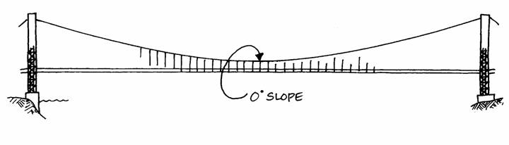 At the midpoint of the main span the slope of the cable is zero, i.e., at the point where it changes from curving downward to curving upward.