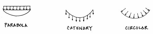 To find the value at any other point along the cables, one must know the slope of the cable and the value of the vertical component at that point. The angle can be found from formulas that describe the shape of the cable. The vertical force component is found from the diagram shown earlier. From structural principles that will be developed in the next analysis, the cables are known to take the shape of a parabola. This is the only form that a flexible structure under uniform load can have. A flexible structure has the natural inclination to this shape so that all its internal forces are axial and tensile. This is most easily understood by imagining a string under any loading: